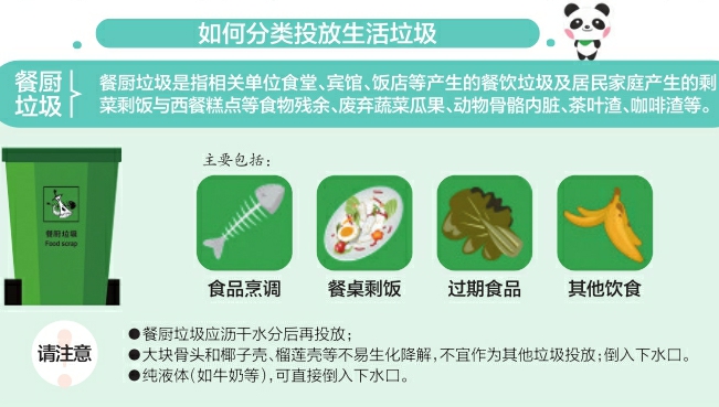 餐廚垃圾是市民生活垃圾中的主要成分之一,主要包括:相關(guān)單位食堂、賓館、飯店等產(chǎn)生的餐飲垃圾及居民家庭產(chǎn)生的剩菜剩飯與西餐糕點(diǎn)等食物殘余、廢棄蔬菜瓜果、動(dòng)物骨骼內(nèi)臟、茶葉渣、咖啡渣等。餐廚垃圾收集容器為綠色。市民在投放餐廚垃圾前一定要注意瀝干其中的水分,以便減少垃圾回收運(yùn)輸途中滲濾液的產(chǎn)生,純液體(如牛奶)可以直接倒入下水口。另外,注意不要將食品包裝袋、飲料瓶、紙巾等與餐廚垃圾一起投放至餐廚垃圾收集容器。